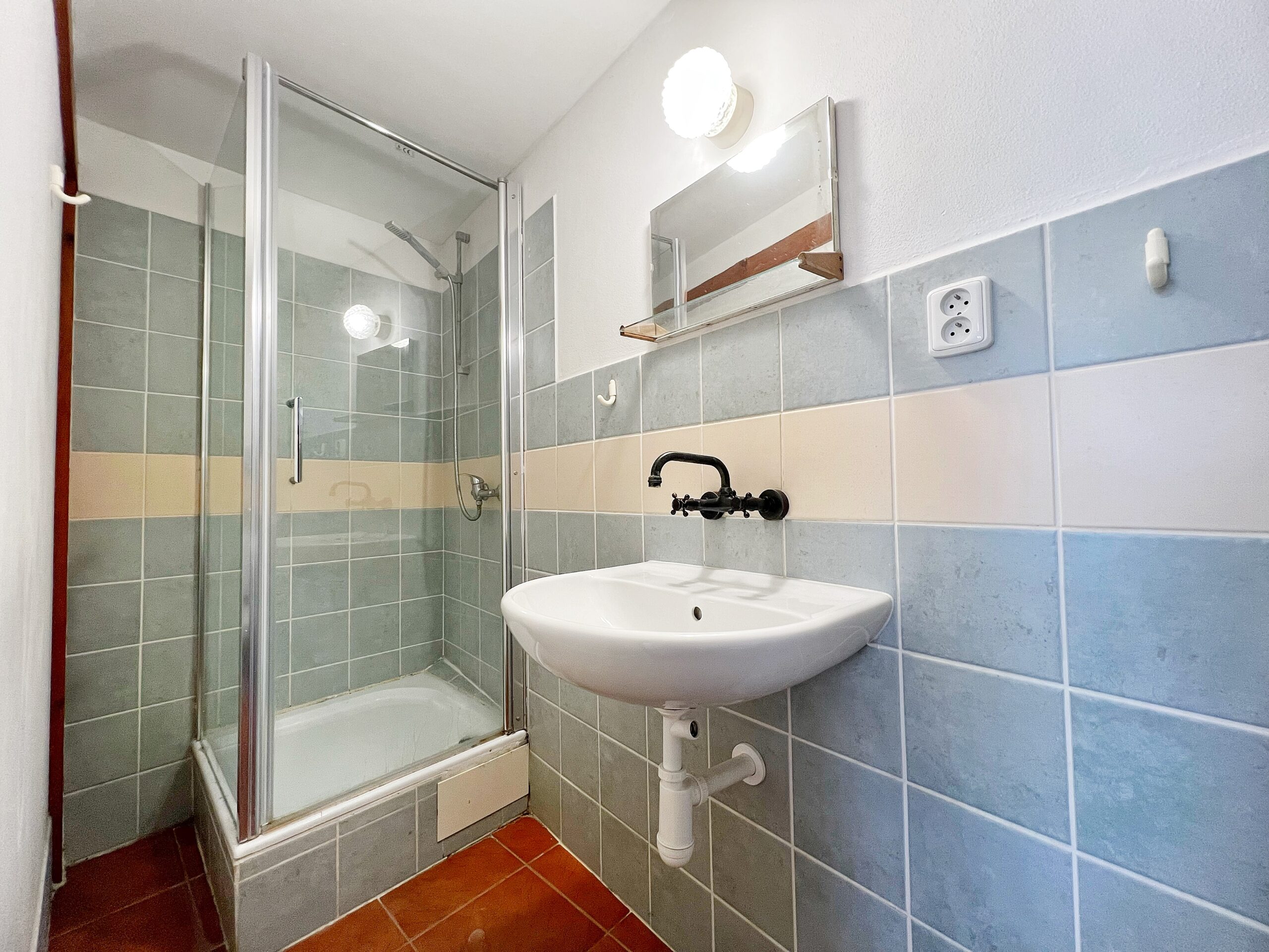 Koupelna původní se sprchovým koutem a WC. Vysoká ulice je jedna ze spojovacích ulic vedoucích přímo na náměstí plná obchodů a občanské vybavenosti.